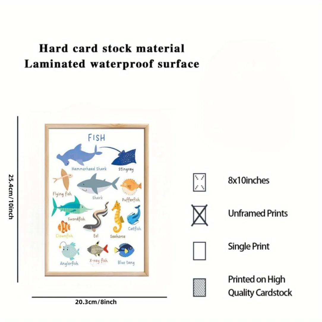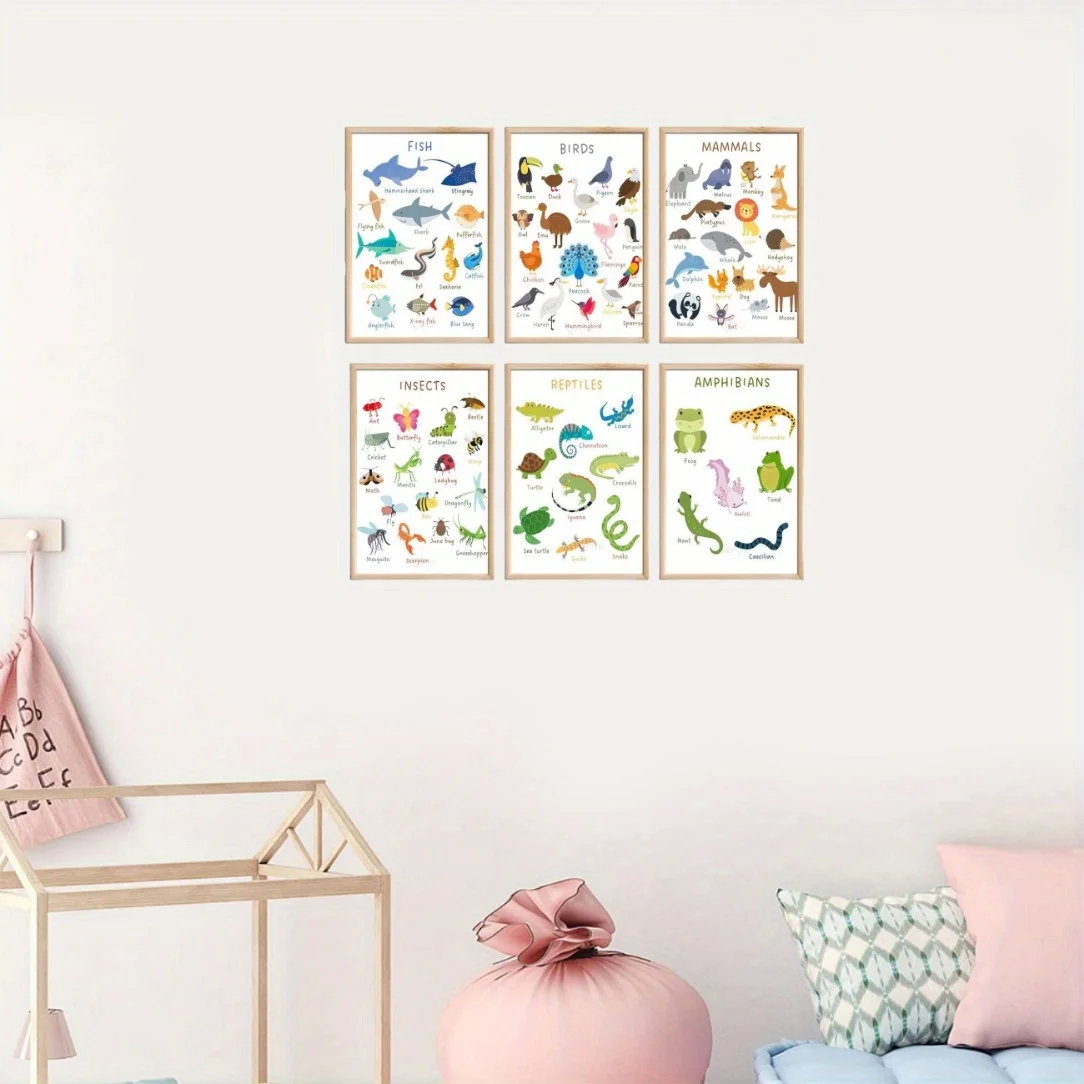 6pcs Educational Preschool Posters Set - Laminated, Waterproof Animal Kingdom Wall Charts | Frameless, 8X10 Inch - Fish, Bird